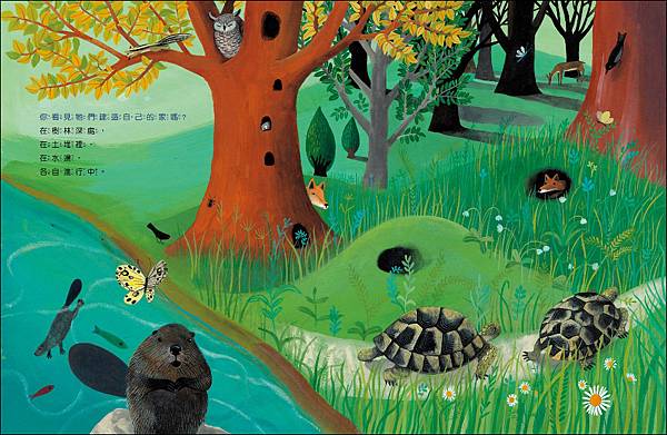 書中呈現多元的動物家園,從草地到天空,從橋墩到池塘,
