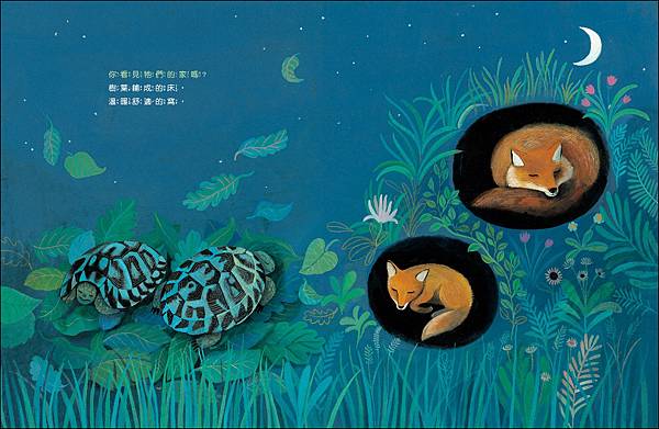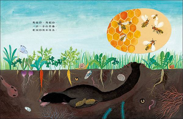 ▲我很喜歡這本書的圖畫,有一種魔幻的色彩。像是動物們一場華麗演出,圖畫呈現不同動物的許多時刻,譬如鼴鼠在地底下挖隧道,土壤中有蚯蚓、甲蟲幼蟲,而地面上花草叢生,蜜蜂飛舞,打開這本書,彷彿能聽見大自然充滿活力的聲音。──美國讀者凱特